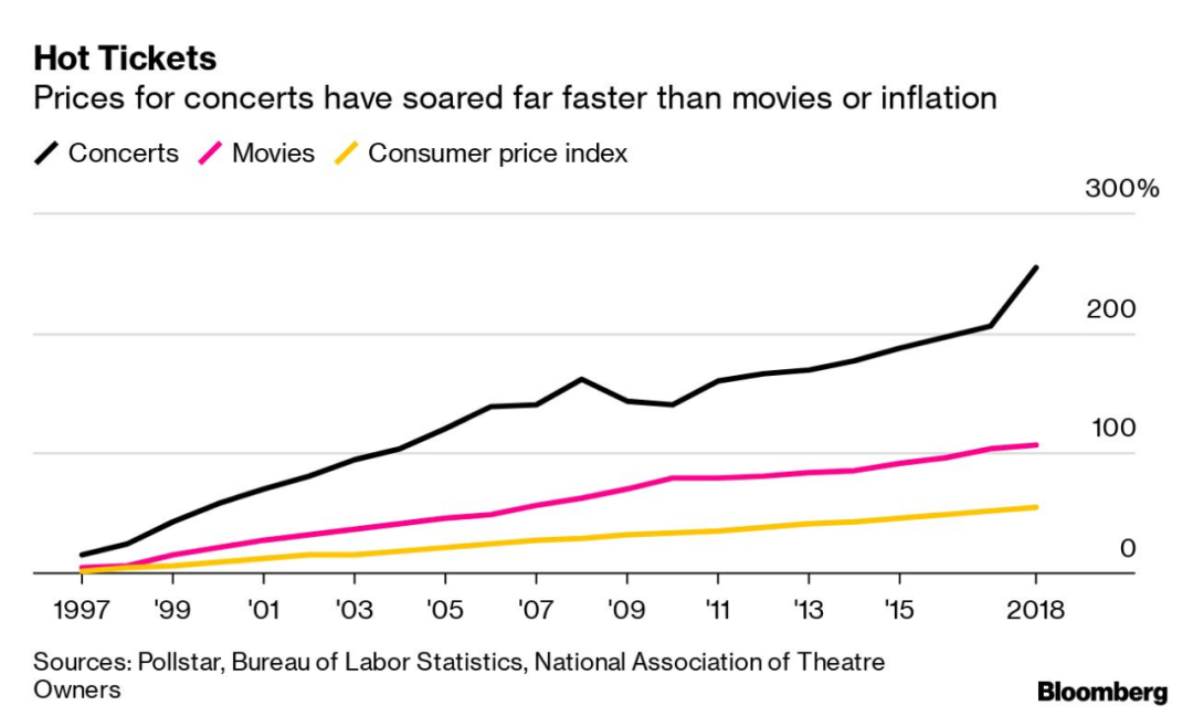然而,票价越来越贵并不仅仅是高人气明星特有的现象。几十年来,现场表演的价格通胀总是高于一般通胀水平。相关数据显示,1948年至1983年间,百老汇音乐剧门票价格上涨了约6.5倍,普通戏剧门票价格上涨了近8倍。与此同时,电影院的平均门票价格上涨了9倍多。1964年至 1976年间,黄金时段一小时的电视节目成本上涨了200%以上。根据《Rockonomics》一书的作者、经济学家Alan Krueger的说法,1981年至2017年,音乐会门票的平均价格从12美元提高到了64美元。而如果与总体通货膨胀保持一致,票价应该只有32美元左右。