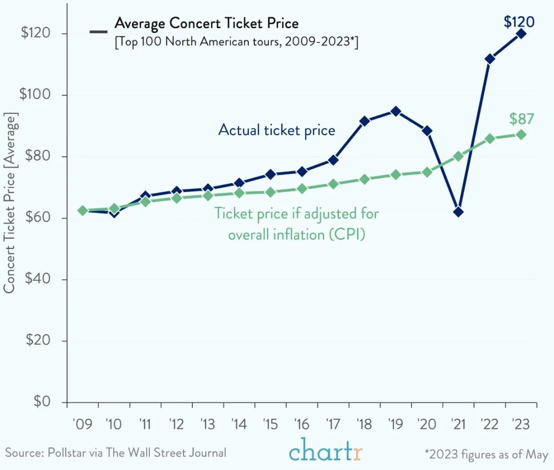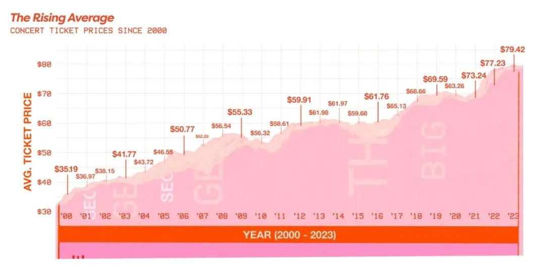 据媒体估计,仅在美国,Taylor Swift的巡演就可以带来价值高达50亿美元(约三百多亿人民币)的经济活动。但这里先不讨论Taylor Swift的经济魔力,而是来看一个更有趣的问题——为什么演唱会门票这么贵,而且越来越贵?这背后的经济学原理是什么?《华尔街日报》将2023 年称为“1000美元音乐会门票年”。以Taylor Swift的巡演票价为例,2018 年澳大利亚巡演的票价与计划于2024年的巡演票价相比,即使考虑了美元和澳元之间的关系,门票价格的通胀也超过了总体通胀。