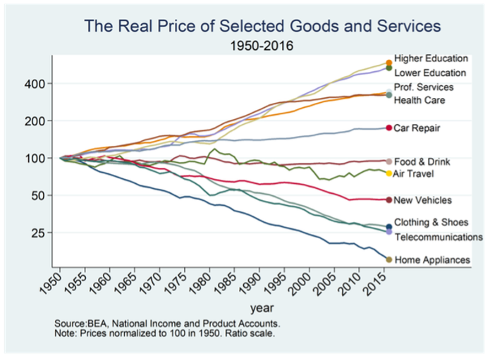 2)成本似乎在60年代和70年代增长最快,而如今增长速度较慢。这符合生产率的增长,而生产率的增长是鲍莫尔效应的主要驱动力。