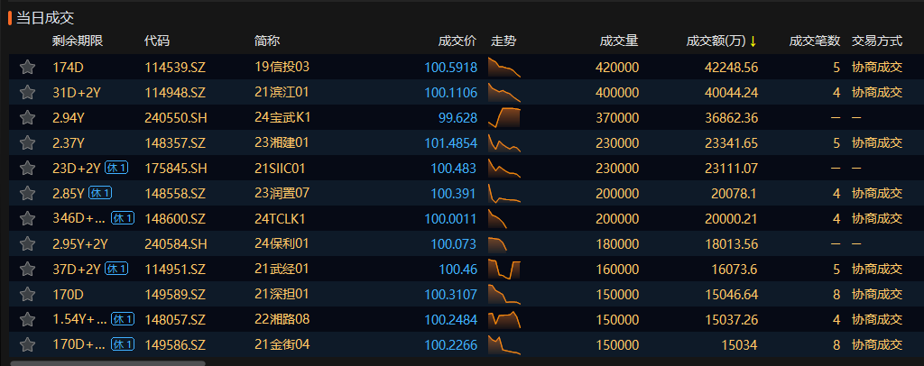 上证报中国证券网讯 据Choice数据显示,交易所信用(非金)债券今日成交额最高的三只债券为:19信投03、21滨江01、24宝武K1,成交额分别为42248.56万元、40044.24万元、36862.36万元。