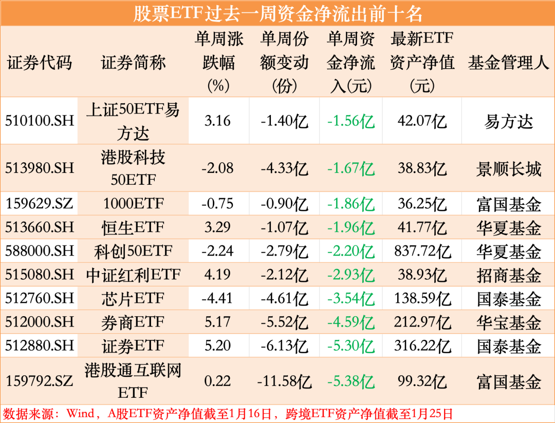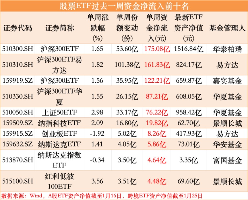 从最近一周股票ETF资金流向上看,沪深300、上证50等权重股集中的ETF仍是资金流入的主要方向。